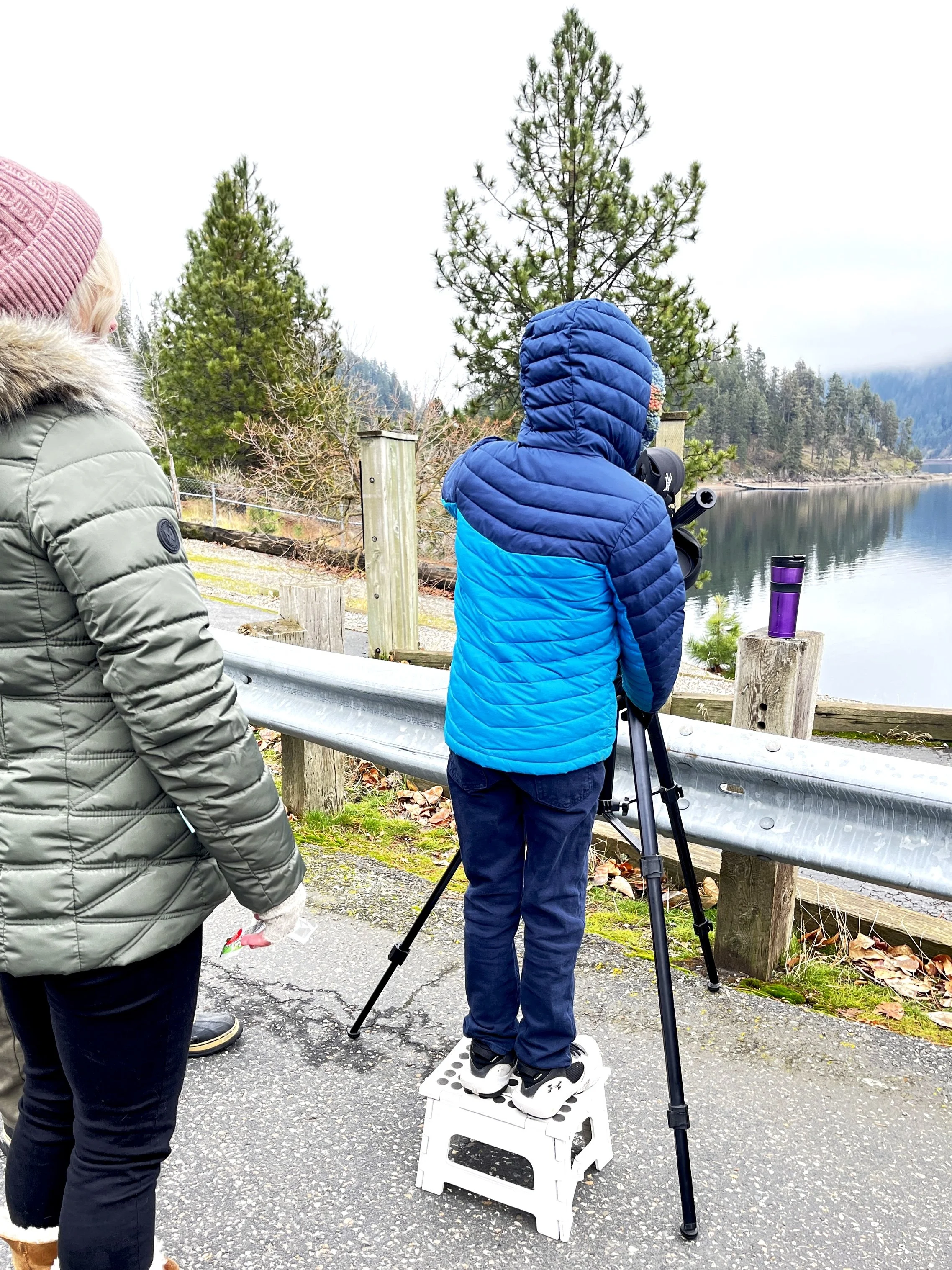 On December 12, Education Coordinator Pam Gomes, along with several Coeur d’Alene Audubon volunteers met students from Hayden Canyon Charter School at Higgens Point. About 90 students looked at eagles through spotting scopes and binoculars, took a hike to the point, and enjoyed cocoa around a propane campfire. Visual aids provided by Pam helped the students see how wide the average eagle wingspan is and gave them a feel for how heavy eagles are, emphasizing the difference in size between male and female eagles. An added bonus was providing the same services (scopes, information, and demonstrations) to about 50 students from the West Valley School District that just happened to be there while we were set up. We also contacted about 50 adults that were out looking for eagles. So, all in all, we contacted and assisted around 190 people in about 2 hours.